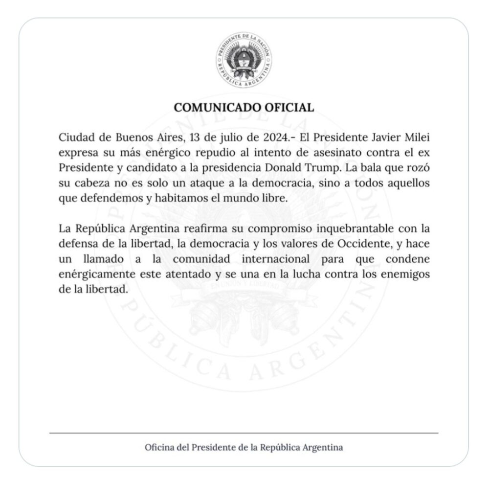 No comunicado, o presidente da Argentina, Javier Milei, expressou seu repúdio ao atentado: “O presidente Javier Milei expressa seu mais energético repúdio à tentativa de assassinato contra o ex-presidente e candidato a presidência Donald Trump”. A declaração sublinha a importância de manter a segurança e a estabilidade política em tempos de eleições, além de reafirmar o compromisso da Argentina com a democracia e a paz.
