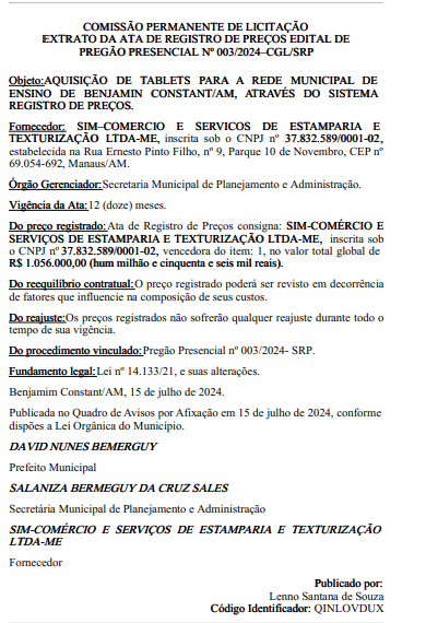 A Prefeitura de Benjamin Constant, no Amazonas, vai gastar R$ 1.056.000,00 com a aquisição de tablets para a rede municipal de ensino. De acordo com o extrato da Ata de Registro de Preços, publicado no Diário Oficial dos Municípios do Amazonas (Doma), a empresa contratada é a SIM-Comércio e Serviços de Estamparia e Texturização Ltda-ME.