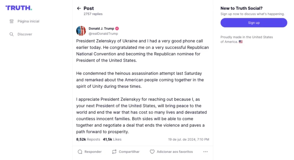 Em sua conta na rede social Truth, Trump descreveu o telefonema como “muito bom”. O republicano garantiu que Zelensky o parabenizou por sua recente nomeação como candidato, que condenou a tentativa de assassinato que ele sofreu em um comício no último sábado (13) e que destacou o “espírito de união” dos americanos.