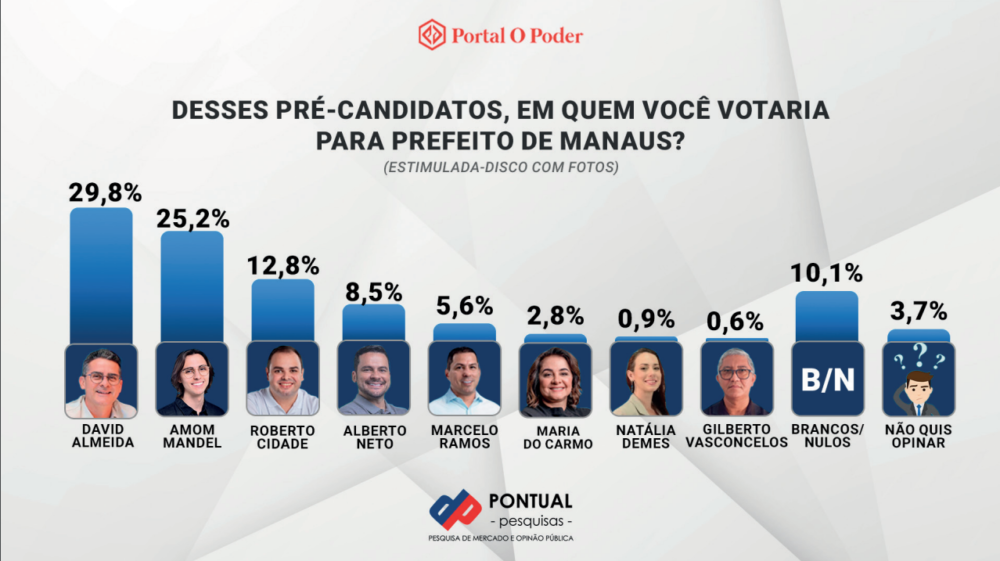 Conforme a publicação, a pesquisa entrevistou 1.066 eleitores, possui margem de erro de 3% e intervalo de confiança de 95%. Está registrada no TRE-AM sob o número 04187/2024. Considerando a margem de erro, David e Amom estão empatados tecnicamente.
