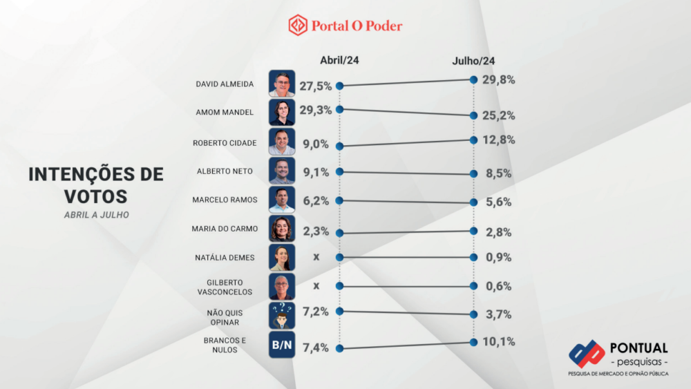 Ainda de acordo com os dados, em relação à pesquisa de abril, o atual prefeito subiu de 27,5% para 29,8%. Amom Mandel, que estava com 29,3%, agora possui 25,2%. Alberto Neto, ocupando o quarto lugar, também caiu, passando de 9,1% para 8,5%.