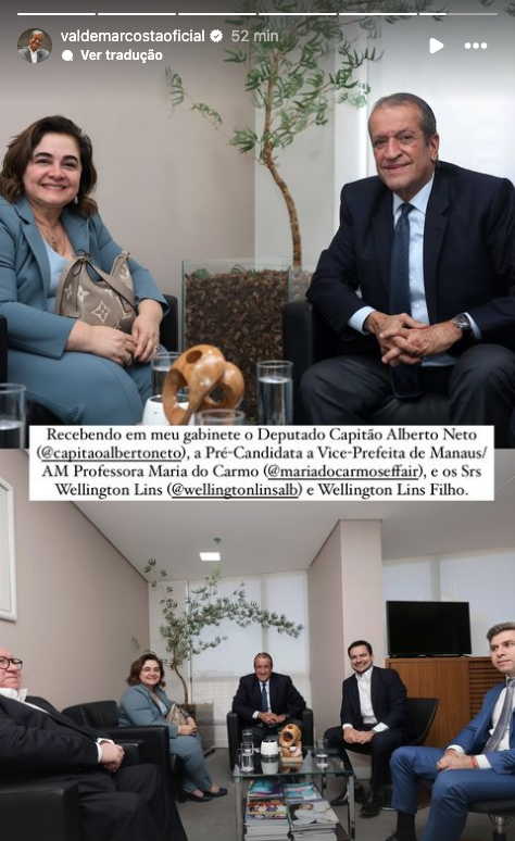 A confirmação ocorre após reuniões de Alberto Neto e Maria do Carmo com Valdemar e com o ex-presidente Jair Bolsonaro, presidente de honra do PL. O encontro foi divulgado por Valdemar em uma rede social. Ele mencionou a reunião com Alberto Neto e Maria do Carmo, além da presença do esposo da empresária, Wellington Lins, e de um dos filhos do casal, Wellington Lins Filho. Na legenda da foto, Valdemar se referiu a Maria do Carmo como “pré-candidata a vice-prefeita de Manaus”.