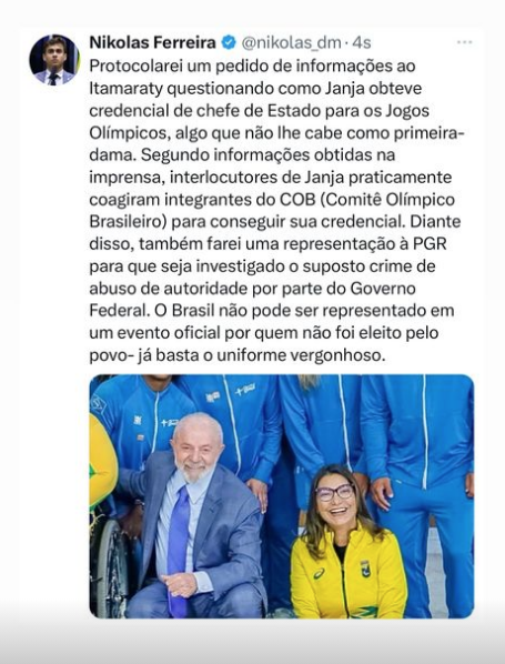 Nikolas alegou que, segundo informações da imprensa, interlocutores de Janja pressionaram o Comitê Olímpico Brasileiro (COB) para conseguir a credencial. Ele também mencionou que fará uma representação à PGR para investigar um suposto crime de abuso de autoridade por parte do Governo Federal.