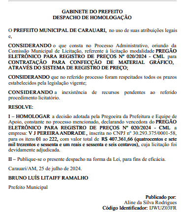 O despacho é assinado pelo prefeito Bruno Luís Litaiff Ramalho. O valor global do contrato é de R$ 407.361,66 (quatrocentos e sete mil, trezentos e sessenta e um reais e sessenta e seis centavos). A licitação, na modalidade Pregão Eletrônico para Registro de Preços nº 020/2024 – CML, foi conduzida pela Comissão Municipal de Licitação, que declarou vencedora a empresa V J Pereira Andrade, inscrita no CNPJ nº 30.293.375/0001-58.