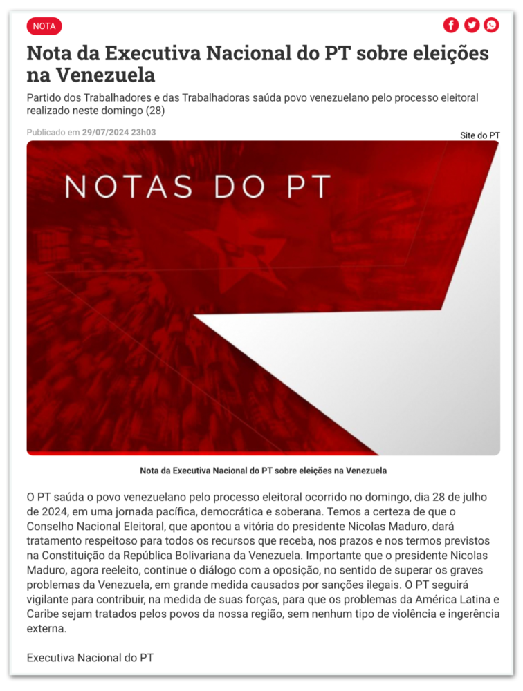 A nota do PT enfatizou a importância de Maduro continuar o diálogo com a oposição para enfrentar os sérios problemas da Venezuela, em grande parte causados por “sanções ilegais”. O PT também declarou que “seguirá vigilante” para que os problemas da América Latina e Caribe sejam tratados sem violência e ingerência externa.