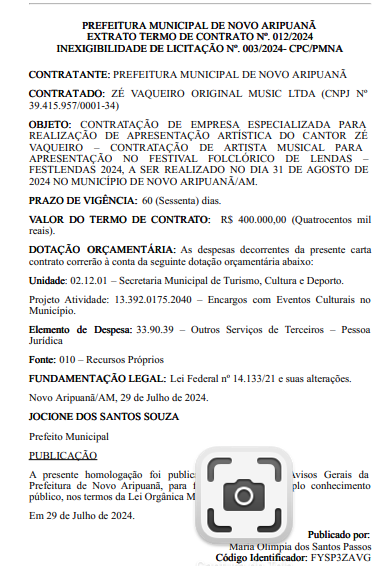 O contrato, de número 012/2024, foi firmado através de um processo de inexigibilidade de licitação, registrado sob o número 003/2024, dispensando a necessidade de concorrência pública. A empresa Zé Vaqueiro Original Music Ltda, inscrita no CNPJ 39.415.957/0001-34, foi a escolhida para a contratação do show.