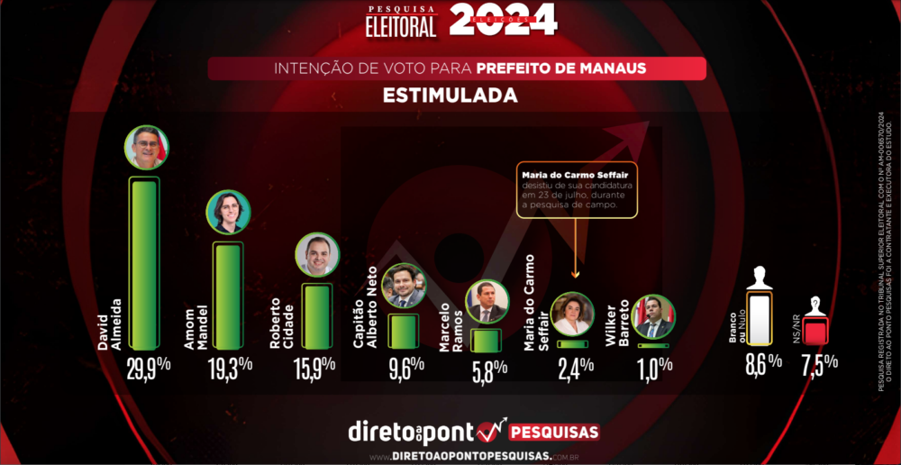 O atual prefeito e candidato à reeleição, David Almeida (Avante), mantém a liderança com 29,9% das intenções de voto. Outros candidatos no cenário incluem o deputado federal Alberto Neto (PL) com 9,6%, o ex-deputado federal Marcelo Ramos (PT) com 5,8%, e o deputado estadual Wilker Barreto (Mobiliza) com 1%. A pesquisa também revela que 7,5% dos eleitores estão indecisos e 8,6% optam por votos nulos ou brancos. Alberto Neto aparece na quarta colocação.