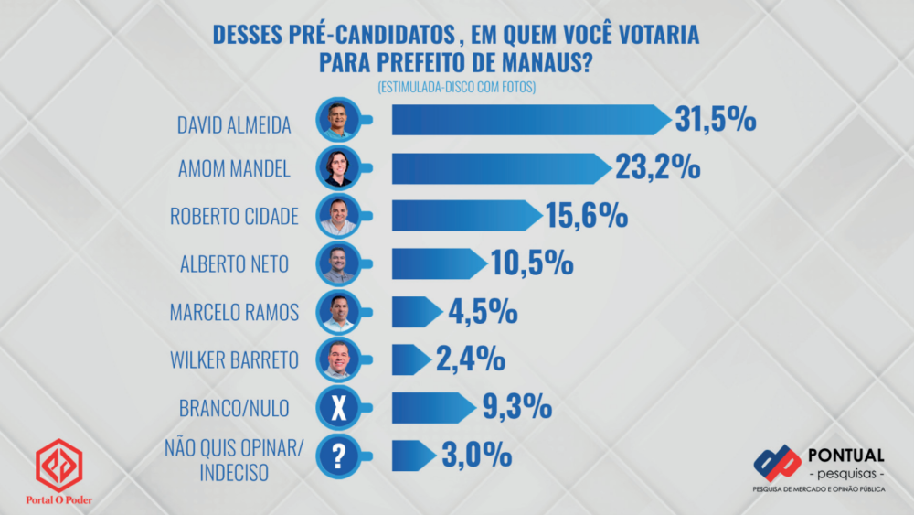 Realizada entre os dias 27 e 31 de julho de 2024, com 1.066 entrevistados e uma margem de erro de 3%, a pesquisa estimulada apresentou os seguintes resultados: David Almeida lidera com 31,5%, seguido por Amom Mandel com 23,2%, Roberto Cidade com 15,6%, Alberto Neto (PL) com 10,5%, Marcelo Ramos com 4,5% e Wilker Barreto (Mobiliza) com 2,4%. Os votos brancos ou nulos somam 9,3% e os indecisos ou que não quiseram opinar são 3,0%.