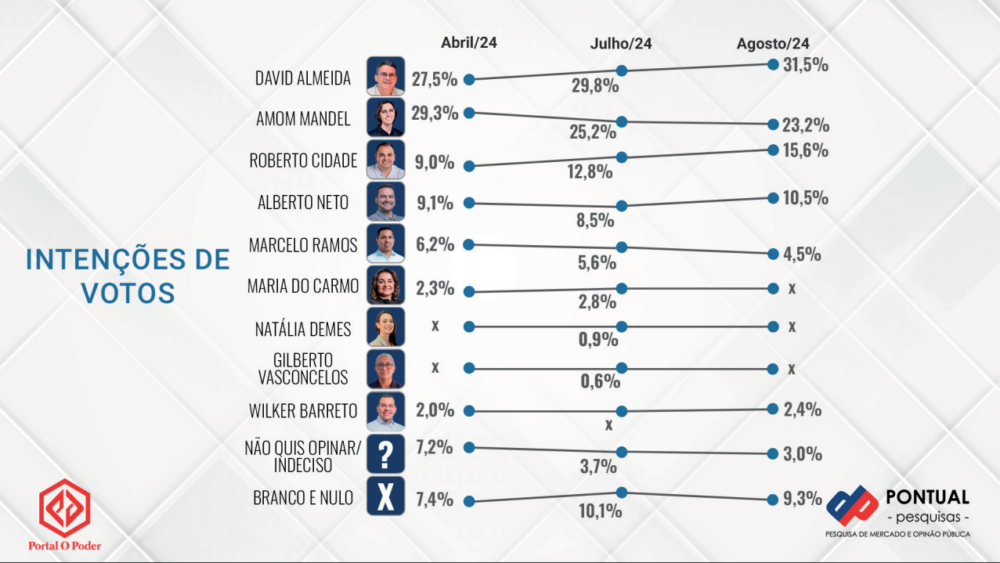 A análise comparativa dos dados ao longo dos últimos meses mostra uma tendência de crescimento para David Almeida, que passou de 27,5% em abril para 31,5% em agosto, e para Roberto Cidade, que aumentou de 9% em abril para 15,6% em agosto. Em contrapartida, Amom Mandel apresentou uma queda de 29,3% em abril para 23,2% em agosto. Marcelo Ramos também teve uma queda, passando de 6,2% em abril para 4,5% em agosto.