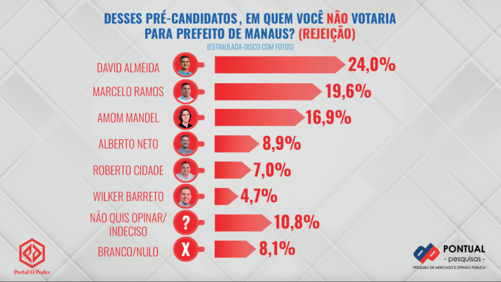 Quanto à rejeição eleitoral, David Almeida lidera com 24,0%, seguido por Marcelo Ramos com 19,6%, Amom Mandel com 16,9%, Alberto Neto com 8,9%, Roberto Cidade com 7,0% e Wilker Barreto com 4,7%.