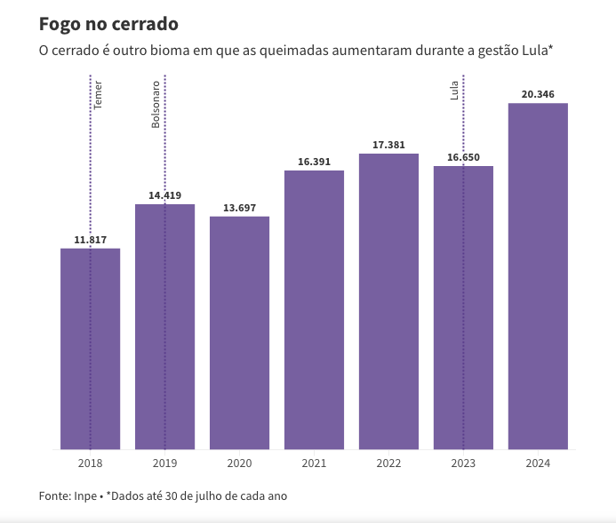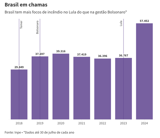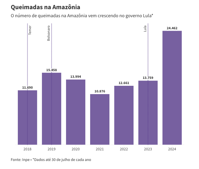 O número de queimadas na Amazônia aumentou 74% sob Lula em comparação com o segundo ano de Bolsonaro, totalizando 24.462 focos em 2024. No Pantanal, 2024 teve o maior número de incêndios desde o início do monitoramento do Inpe em 1998. No cerrado, houve 20.346 queimadas até 30 de julho, o pior resultado desde 2010.