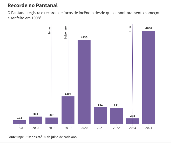 A gestão de Lula (PT) na questão ambiental apresenta indicadores piores que o governo de Jair Bolsonaro (PL). O número de queimadas aumentou desde a posse de Lula, com o Pantanal registrando 4.696 focos de incêndio entre 1º de janeiro e 30 de julho de 2024, um aumento de 1.523% em relação ao ano anterior. Os dados são do Instituto Nacional de Pesquisas Espaciais (Inpe).