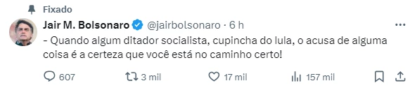Em resposta, Bolsonaro desqualificou Maduro em suas redes sociais. “Quando algum ditador socialista, cupincha do Lula, o acusa de alguma coisa, é a certeza que você está no caminho certo.”, disse o ex-capitão.