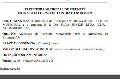 A Prefeitura de Eirunepé, no Amazonas, firmou um contrato no valor de R$ 845.000,00 para a aquisição de uma Patrulha Mecanizada destinada à recuperação de estradas vicinais no município. A empresa contratada para fornecer o equipamento é a E R da Silva Junior Ltda, conforme o extrato do contrato publicado nesta segunda-feira (19/8).