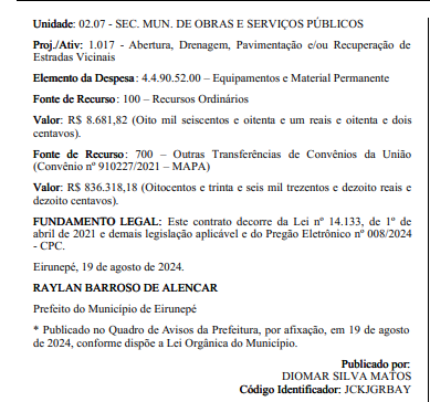 O contrato, celebrado através do Pregão Eletrônico nº 008/2024, terá vigência de 12 meses a partir da data de assinatura. De acordo com os termos, a Patrulha Mecanizada será empregada em atividades como abertura, drenagem e pavimentação das estradas vicinais. O contrato foi assinado pelo prefeito Raylan Barroso de Alencar.