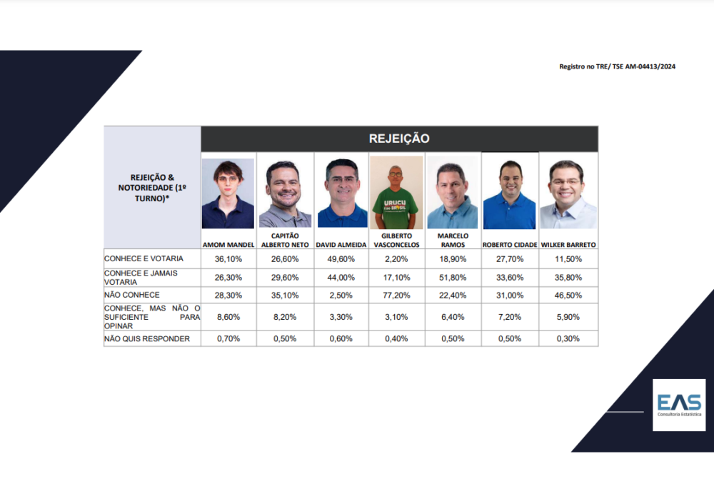 Roberto Cidade (União Brasil) também enfrenta um desafio significativo em termos de rejeição. Com 33,60% dos eleitores afirmando que jamais votariam nele e 27,70% dispostos a votar, Cidade precisa trabalhar para melhorar sua aceitação entre o eleitorado.