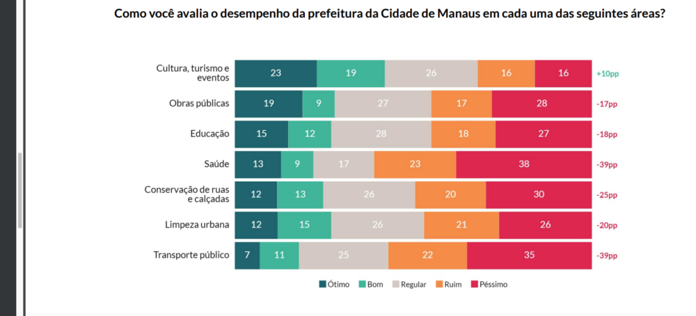 Outras áreas avaliadas incluem obras públicas, com 28% de avaliações “péssimas”, educação com 27%, e limpeza urbana com 26%. A área de cultura, turismo e eventos teve a menor taxa de avaliação “péssima”, com 16%.
