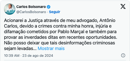 A resposta do vereador veio com tom de advertência: “Acionarei a Justiça, por meio do meu advogado Antônio Carlos, devido aos crimes contra minha honra, injúria e difamação cometidos por Pablo Marçal, além de buscar provar as inverdades recentemente propagadas”, declarou Carlos Bolsonaro em uma publicação na rede social X, antigo Twitter.