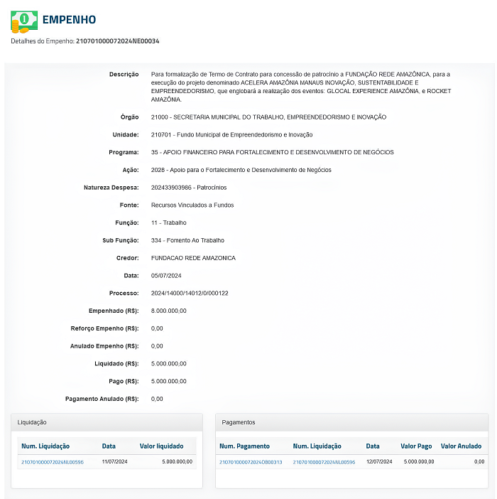 Segundo o Extrato de Patrocínio, publicado no Diário Oficial do Município (DOM) em 10 de julho deste ano, assinado pelo secretário Municipal em Exercício do Trabalho, Empreendedorismo e Inovação (Semtepi), Joel Sales, a verba de patrocínio é destinada ao projeto “Acelera Amazônia Manaus Inovação, Sustentabilidade e Empreendedorismo”, que inclui os eventos Glocal Experience Amazônia e Rocket Amazônia.
