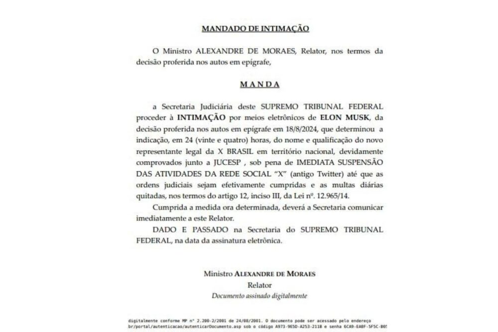 De acordo com o mandado de intimação assinado pelo ministro do STF, a Secretaria Judiciária deve localizar Elon Musk por meios eletrônicos, com o objetivo de que o empresário da rede social X informe quem será o responsável legal pela plataforma no país. Segundo o documento expedido para Musk, se um representante legal não for identificado dentro dessas 24 horas, a rede social X não poderá mais ser acessada pelos brasileiros.