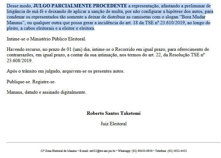 “Desse modo, julgo parcialmente procedente a representação, afastando a preliminar de litigância de má-fé e deixando de aplicar a sanção de multa, por não configurar a hipótese dos autos, para condenar os representados tão somente a deixar de distribuir as camisetas com o slogan “Bora Mudar Manaus”, ou qualquer outra que possa gerar a incidência do art. 18 da TSE nº 23.610/2019, ao longo do pleito, a cabos eleitorais e a eleitor e eleitora”, decidiu Taketomi.