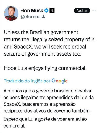 “A menos que o governo brasileiro devolva a propriedade ilegalmente apreendida da X e da SpaceX, buscaremos a apreensão recíproca de ativos governamentais também. Espero que Lula goste de voar em voo comercial”, escreveu.