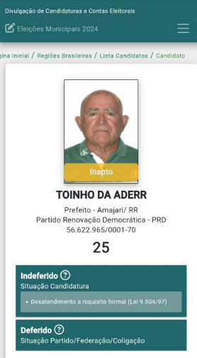 Nesta quinta-feira (12), a Justiça Eleitoral indeferiu a candidatura de Toinho da Ader. Ele disputava o cargo de chefe do Executivo municipal em Amajari, que fica a 157 km da capital de Roraima.