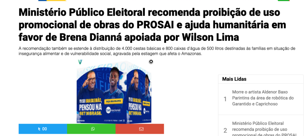 Uma matéria afirmou que o Ministério Público Eleitoral emitiu uma recomendação para proibir o uso promocional das obras do PROSAI e da distribuição de cestas básicas e caixas d’água em favor da candidatura de Brena Dianná. No entanto, o documento não especifica que tais ações estejam vinculadas à candidatura de Brena Dianná.