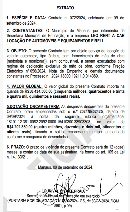 A empresa Leo Rent a Car, envolvida em pagamentos à Izabelle Fontenelle, noiva do prefeito de Manaus, David Almeida, assinou recentemente um contrato milionário com a Prefeitura de Manaus no valor de R$ 50,4 milhões. O acordo prevê a prestação de serviços de aluguel de ônibus com motoristas para a Secretaria Municipal de Educação (Semed), que é comandada pela irmã do prefeito, Dulce Almeida. O contrato tem duração de 12 meses, com um custo mensal de R$ 4,2 milhões.