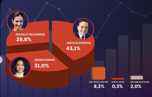 A pesquisa também revelou que as candidatas Michele Valadares e Brena Dianná possuem índices de rejeição de 28,8% e 31%, respectivamente. O levantamento ouviu 450 eleitores de Parintins e comunidades do Amazonas entre os dias 19 e 20 de setembro de 2024. A margem de erro é de 4,6%, com um nível de confiança de 95%.