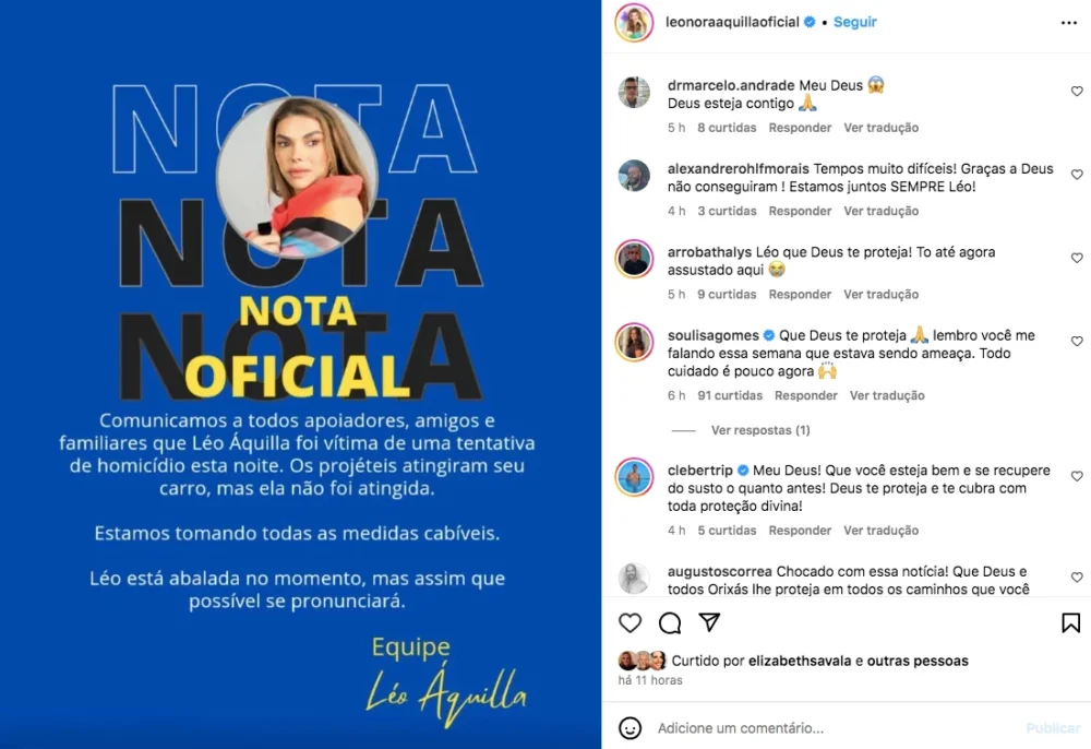 A candidata a vereadora de São Paulo Leonora Áquilla, mais conhecida como Léo Áquilla, que concorre pelo MDB, foi vítima de uma tentativa de homicídio na noite desta quinta-feira (26/9). A apresentadora, transexual, estava dentro de seu veículo no momento em que foi atingida por tiros, de acordo com informações divulgadas em seu perfil no Instagram.