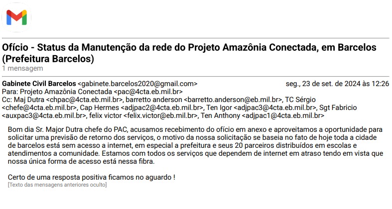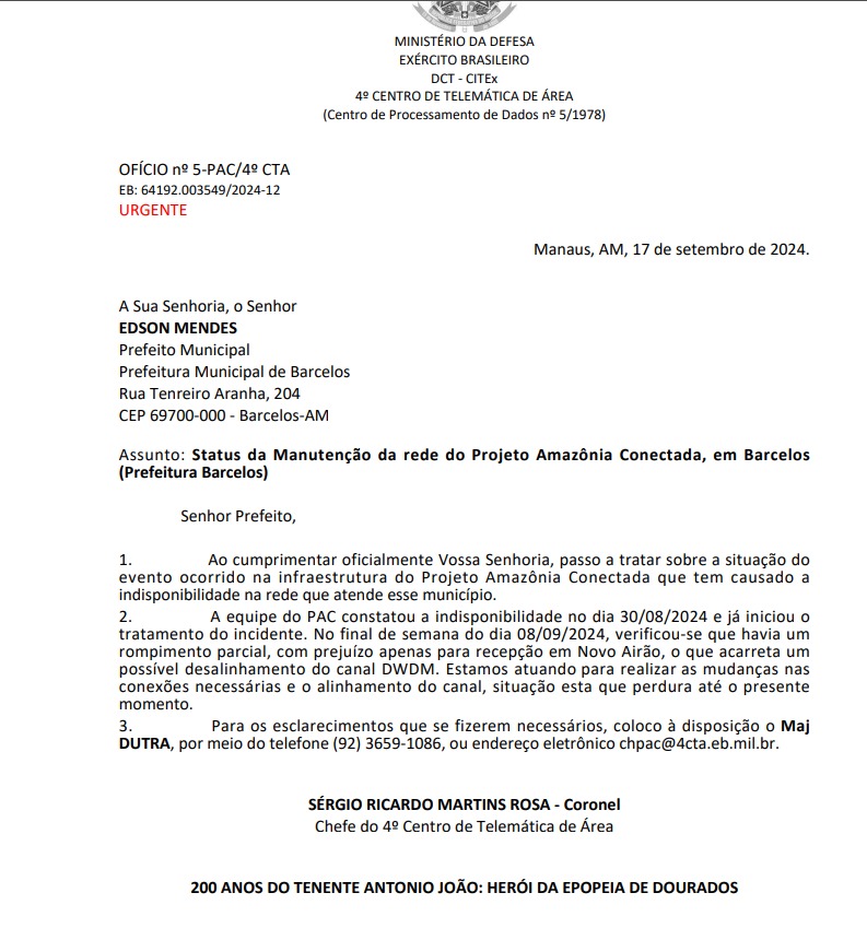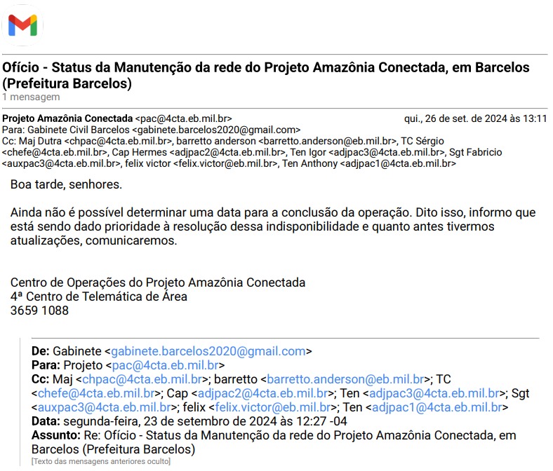 Embora o Exército tenha sido acionado para resolver os problemas, a resposta, segundo fontes locais, tem sido insatisfatória. A Prefeitura de Barcelos chegou a enviar ofícios cobrando explicações e medidas para a recuperação da fibra, mas a resposta foi vaga e sem detalhes. Há relatos de que a solução só será encaminhada quando houver disponibilidade de recursos e materiais necessários, sem prazo definido para a execução do conserto.