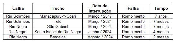 São Gabriel da Cachoeira está sem fibra ótica desde 30 de março de 2024, totalizando 7 meses de interrupção. Santa Isabel do Rio Negro enfrenta a mesma situação desde junho de 2024, com 4 meses sem conexão. Barcelos está sem conectividade desde o final de agosto de 2024, totalizando 2 meses. Além dessas três cidades, Tefé está com rompimento da fibra ótica desde março de 2024, ampliando para 7 meses o período de interrupção.