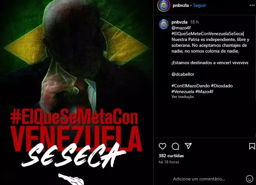 Com tom desafiador, o cartaz ainda traz os dizeres: “Nossa pátria é independente, livre e soberana. Não aceitamos chantagens de ninguém, não somos colônia de ninguém”. A divulgação coincidiu com a convocação do embaixador venezuelano e ocorre em meio a críticas do regime de Maduro tanto ao presidente Lula quanto a Celso Amorim.