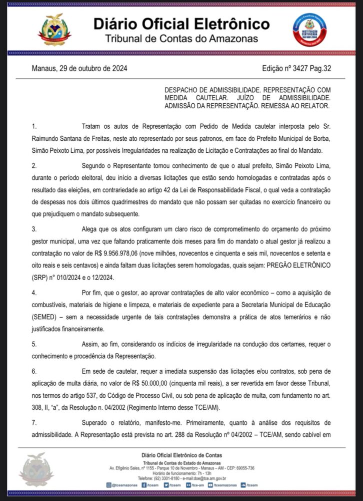 O corpo jurídico do prefeito eleito de Borba, Raimundo Santana, conhecido como Toco Santana, entrou com uma medida cautelar junto ao Tribunal de Contas do Estado do Amazonas (TCE-AM) para bloquear licitações promovidas pelo atual prefeito, Simão Peixoto. A solicitação foi publicada nesta terça-feira (29), no Diário Oficial do TCE-AM.