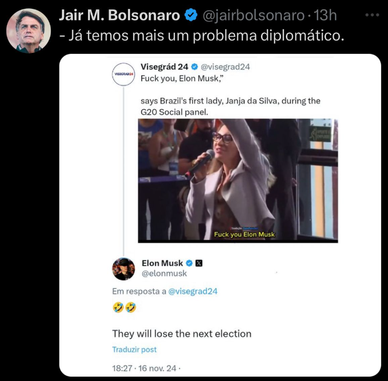 O ex-presidente Jair Bolsonaro (PL) se manifestou após a recente troca de farpas entre a primeira-dama Janja Lula e o empresário Elon Musk. Musk, que recentemente foi indicado por Donald Trump para chefiar o departamento de eficiência governamental nos Estados Unidos, rebateu um xingamento feito por Janja durante um evento no Rio de Janeiro.