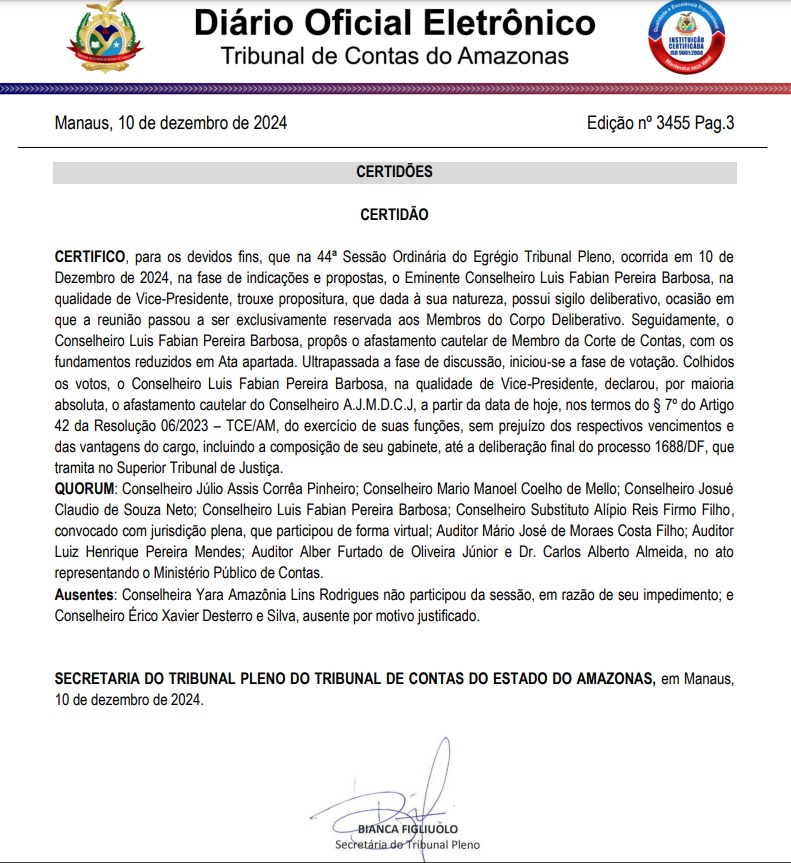 Segundo o documento, o conselheiro Luis Fabian Pereira Barbosa, na qualidade de vice-presidente do órgão, foi o responsável por propor, na reunião entre os conselheiros, o afastamento do conselheiro Ari Moutinho Júnior do exercício de suas atividades, sendo a medida aprovada por maioria em sessão sigilosa. A decisão foi tomada com base no disposto no Artigo 7º da Lei nº 42 (referente à Resolução 06/2023 do TCE-AM) e objetiva preservar a integridade do processo em tramitação no STJ.