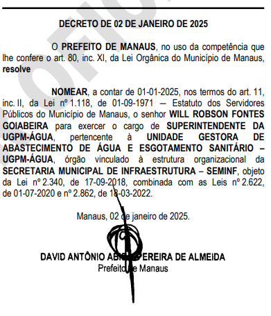 Após sua derrota nas eleições municipais de 2024, o ex-candidato a vereador pelo Agir, Will Robson Fontes Goiabeira, conhecido como “Goiabeira”, foi nomeado nesta quinta-feira (2) para o cargo de superintendente da Unidade Gestora de Abastecimento de Água e Esgotamento Sanitário (UGPM-Água), vinculada à Secretaria Municipal de Infraestrutura (Seminf). A nomeação foi publicada no Diário Oficial do Município (DOM) e já está assinada pelo prefeito David Almeida.