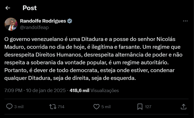 “O governo venezuelano é uma ditadura, e a posse do senhor Nicolás Maduro, ocorrida hoje, é ilegítima e farsante. Um regime que desrespeita os Direitos Humanos, a alternância de poder e a soberania da vontade popular é um regime autoritário”, afirmou Randolfe em suas redes sociais.