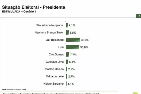 No cenário estimulado, a pesquisa detalhou as preferências do eleitorado, para as eleições de Presidente da República, o ex-presidente Jair Bolsonaro (PL) aparece a frente com 36,0% em seguida vem o presidente Lula (PT) com 33,8%. A populariddae do petista caiu grandemente devido as suas últimas declarações à frente do executivo.