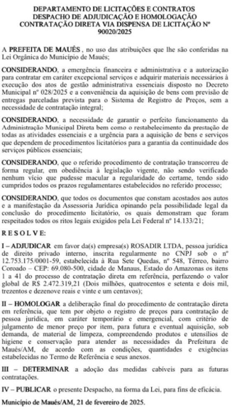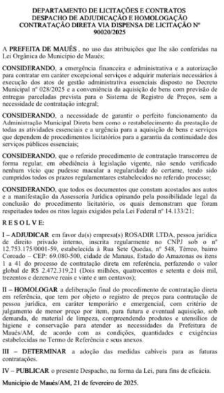 A Prefeitura de Maués, no interior do Amazonas, homologou dois contratos emergenciais no valor total de R$ 5.040.923,35, conforme estabelecido pelo Decreto Municipal n.º 028/2025, que declarou situação de emergência financeira e administrativa no município. Essa medida permite a aquisição direta de bens e serviços essenciais para garantir a continuidade dos serviços públicos.