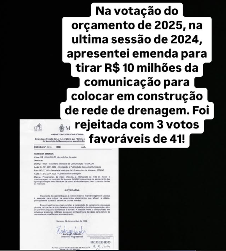 Após as fortes chuvas que atingiram Manaus na terça-feira (4), com várias ocorrências registradas pela cidade, o vereador Rodrigo Guedes (PP) se manifestou sobre a votação do orçamento de 2025, realizada na última sessão de 2024. Durante a votação, Guedes apresentou uma emenda que propunha destinar R$ 10 milhões, originalmente alocados para a Secretaria Municipal de Comunicação (SEMCOM), para a construção de redes de drenagem em Manaus. No entanto, a emenda foi rejeitada pela maioria dos vereadores da base do prefeito, com apenas três votos favoráveis de um total de 41.