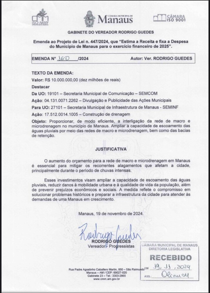 Em sua justificativa, o vereador destacou a urgência de investimentos em drenagem para enfrentar os constantes alagamentos, principalmente durante o período de chuvas intensas. “O aumento do orçamento para a rede de macro e microdrenagem é fundamental para mitigar os recorrentes alagamentos em Manaus, melhorar a mobilidade urbana e a qualidade de vida da população”, afirmou Guedes, que argumentou ser essencial ampliar a capacidade de escoamento das águas pluviais, reduzir danos à mobilidade e prevenir prejuízos econômicos e sociais.