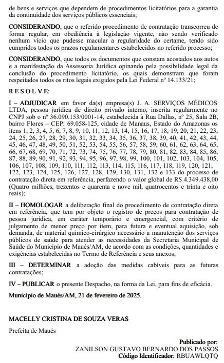 A prefeita de Maués, Macelly Veras, assinou mais um contrato sem licitação para a compra de materiais químico-cirúrgicos, desta vez no valor de R$ 4,3 milhões. O acordo foi firmado com a empresa J.A. Serviços Médicos LTDA e publicado no Diário Oficial Eletrônico dos Municípios do Amazonas, tendo sido assinado no dia 21 de fevereiro.