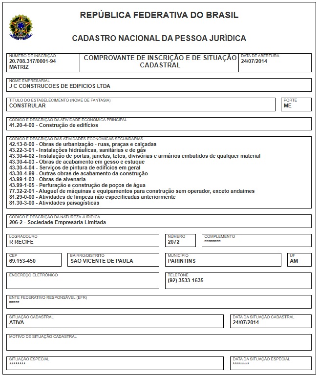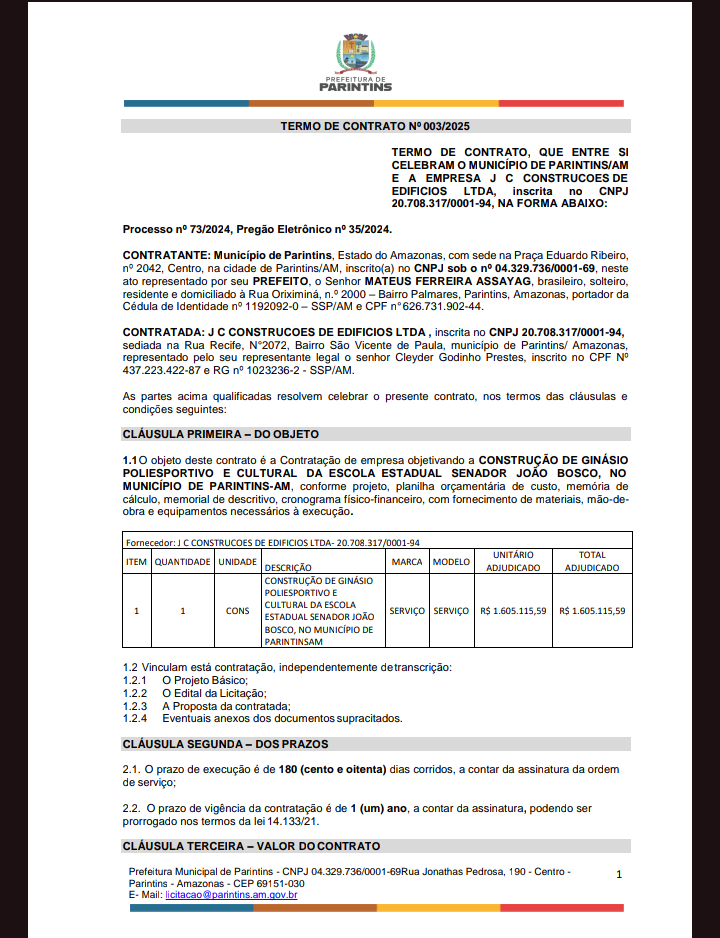 De acordo com informações da transparência municipal, a J C Construções já firmou três contratos com a Prefeitura de Parintins entre 2024 e janeiro de 2025, somando R$ 3.546.023,64. A empresa atua no ramo da construção civil desde 2014 sob o nome fantasia “Constrular” e tem capital social de R$ 700 mil.