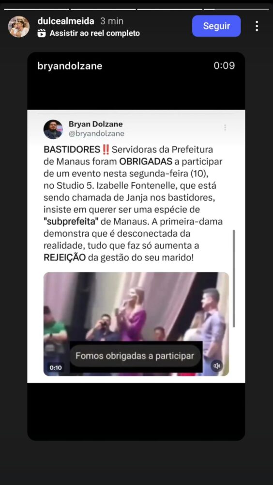 Dulce Almeida repostou um conteúdo do analista político Bryan Dolzane, que afirmava que servidoras da Prefeitura de Manaus teriam sido obrigadas a comparecer a um evento realizado no Studio 5. Segundo relatos, Izabelle Fontenelle estaria atuando como “subprefeita” e sendo comparada a “Janja”.