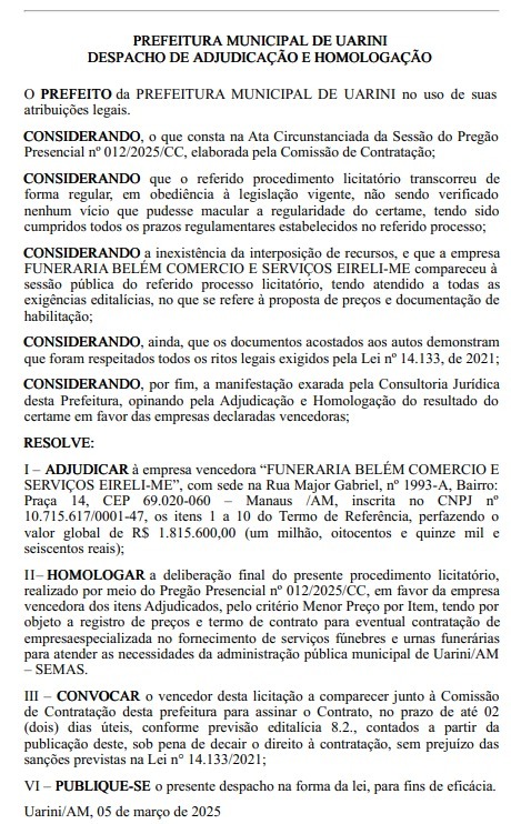 O prefeito do município de Uarini, Marcos Martin, divulgou no Diário Oficial da Associação dos Municípios do Amazonas (AAM) nesta segunda-feira (10) os extratos de contratações para o fornecimento de serviços funerários, totalizando mais de R$ 1,8 milhão.