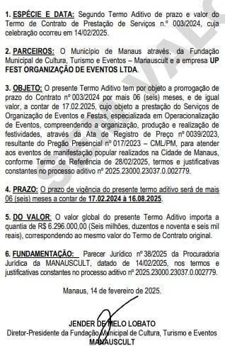Os contratos foram renovados sob a gestão do diretor-presidente da Manauscult, Jender Lobato, e contemplam a contratação de empresas especializadas na realização e produção de festividades e manifestações populares de grande e médio porte na capital. No entanto, os documentos não especificam quais eventos serão contemplados pelos serviços contratados.