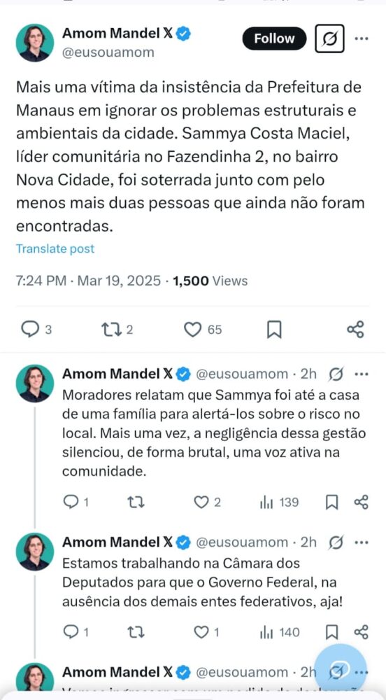 O deputado federal Amom Mandel (Cidadania) utilizou suas redes sociais para denunciar a negligência da Prefeitura de Manaus diante dos problemas estruturais e ambientais da cidade. Em publicação na plataforma X, ele lamentou a morte da líder comunitária Samnya Costa Maciel, que foi soterrada junto a outras duas pessoas no bairro Nova Cidade, na comunidade Fazendinha 2.