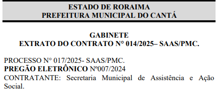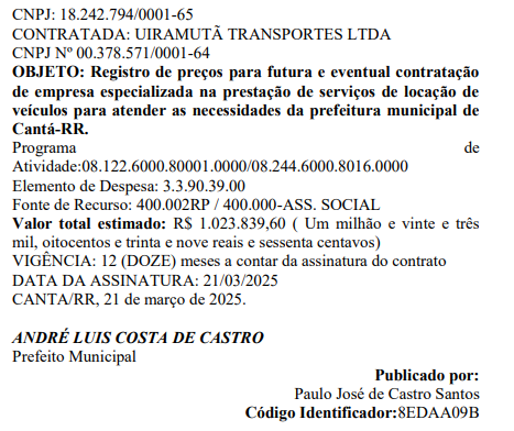 A Prefeitura de Cantá, em Roraima, firmou um contrato no valor de R$ 1.023.839,60 para a locação de veículos com a empresa Uiramutã Transportes Ltda. O contrato, assinado no dia 21 de março de 2025, tem vigência de 12 meses e foi celebrado por meio do Pregão Eletrônico nº 007/2024.